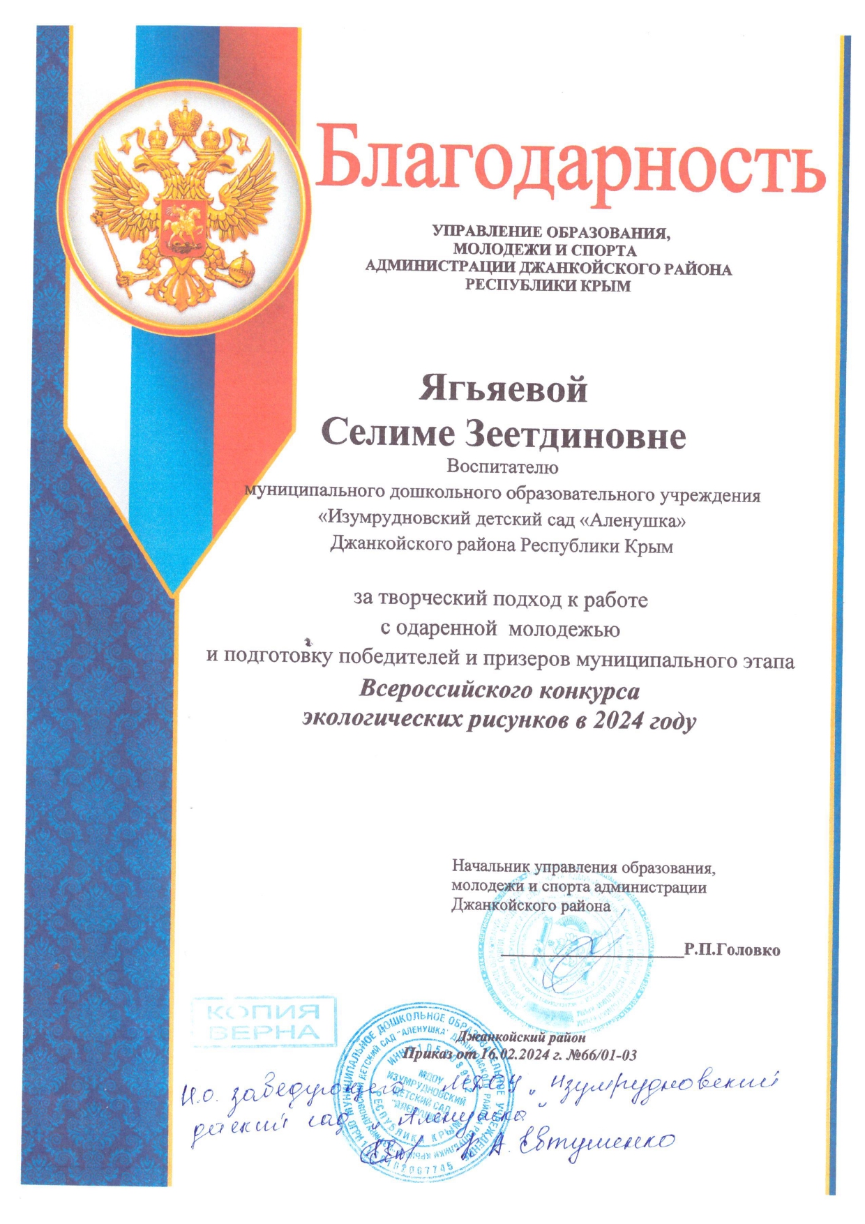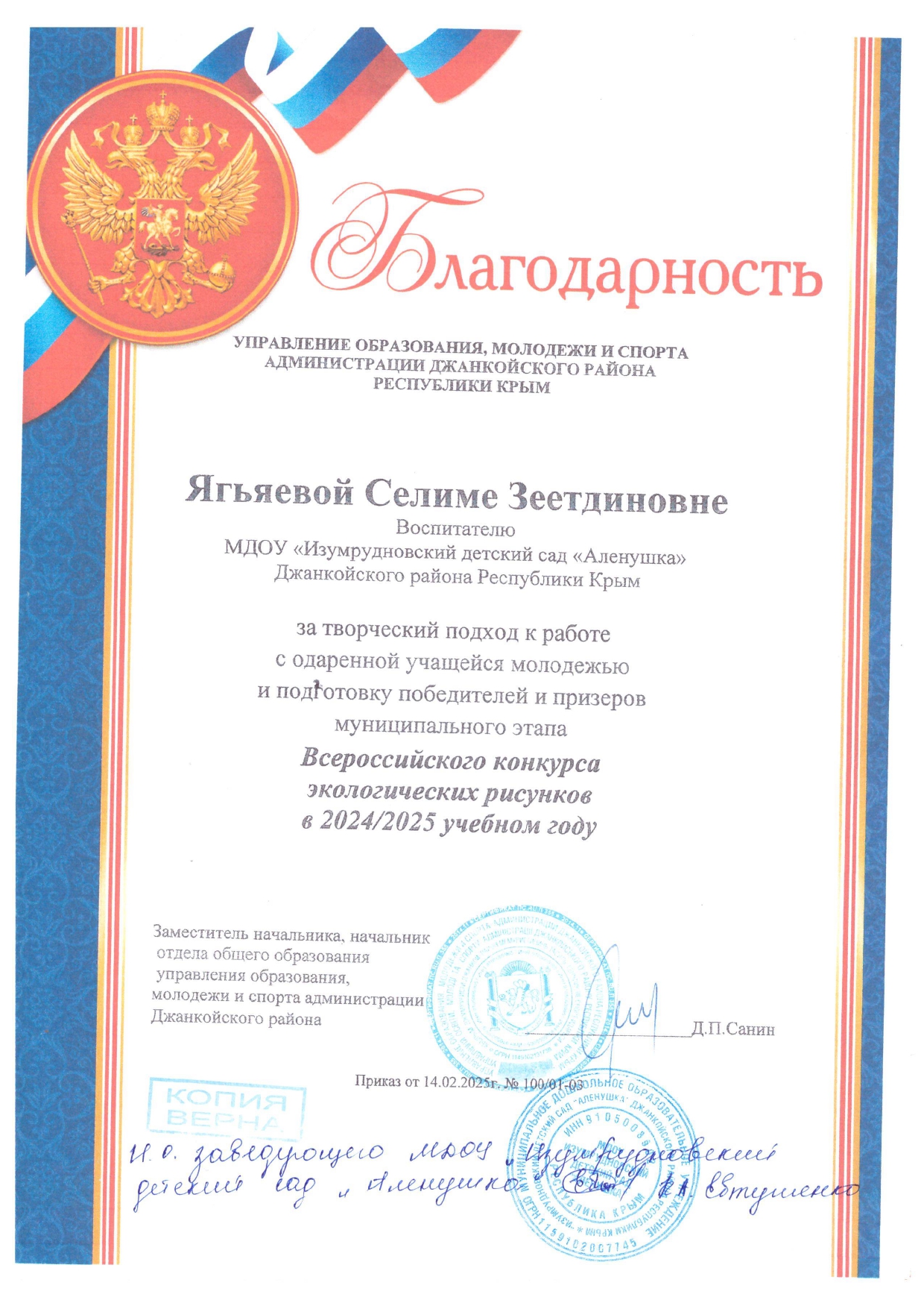 за творческий подход к работе с одаренной учащейся молодежью и подготовку победителей и призеров муниципального этапа Республиканского конкурса «Чистый Крым» в 2024 году, № 402/01-03 от 31.10.2024г.