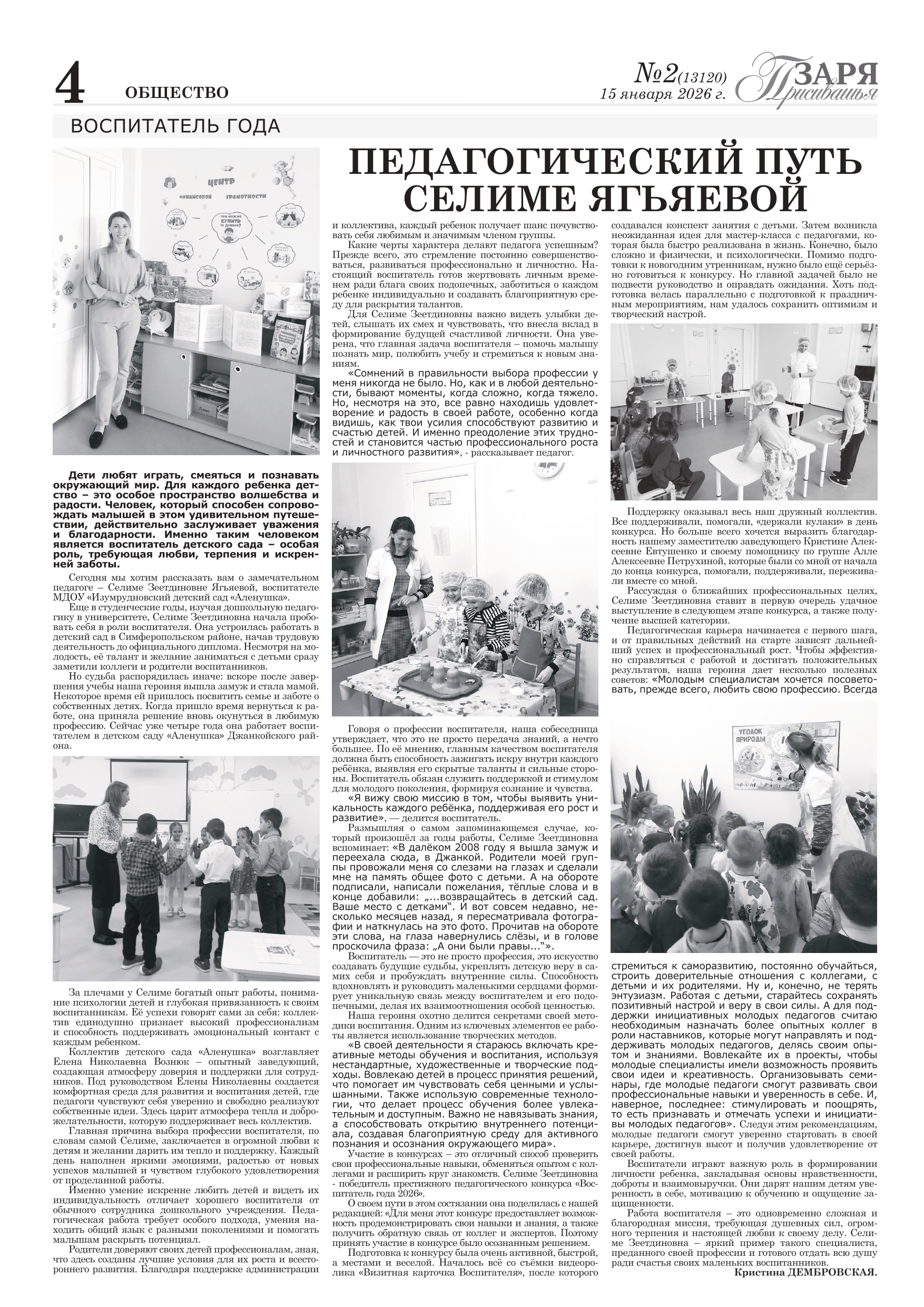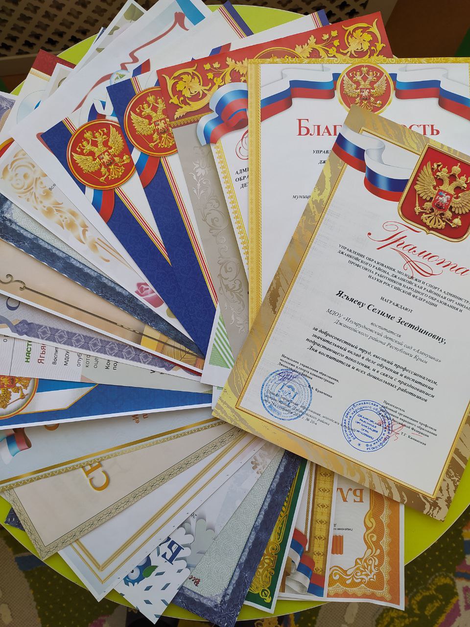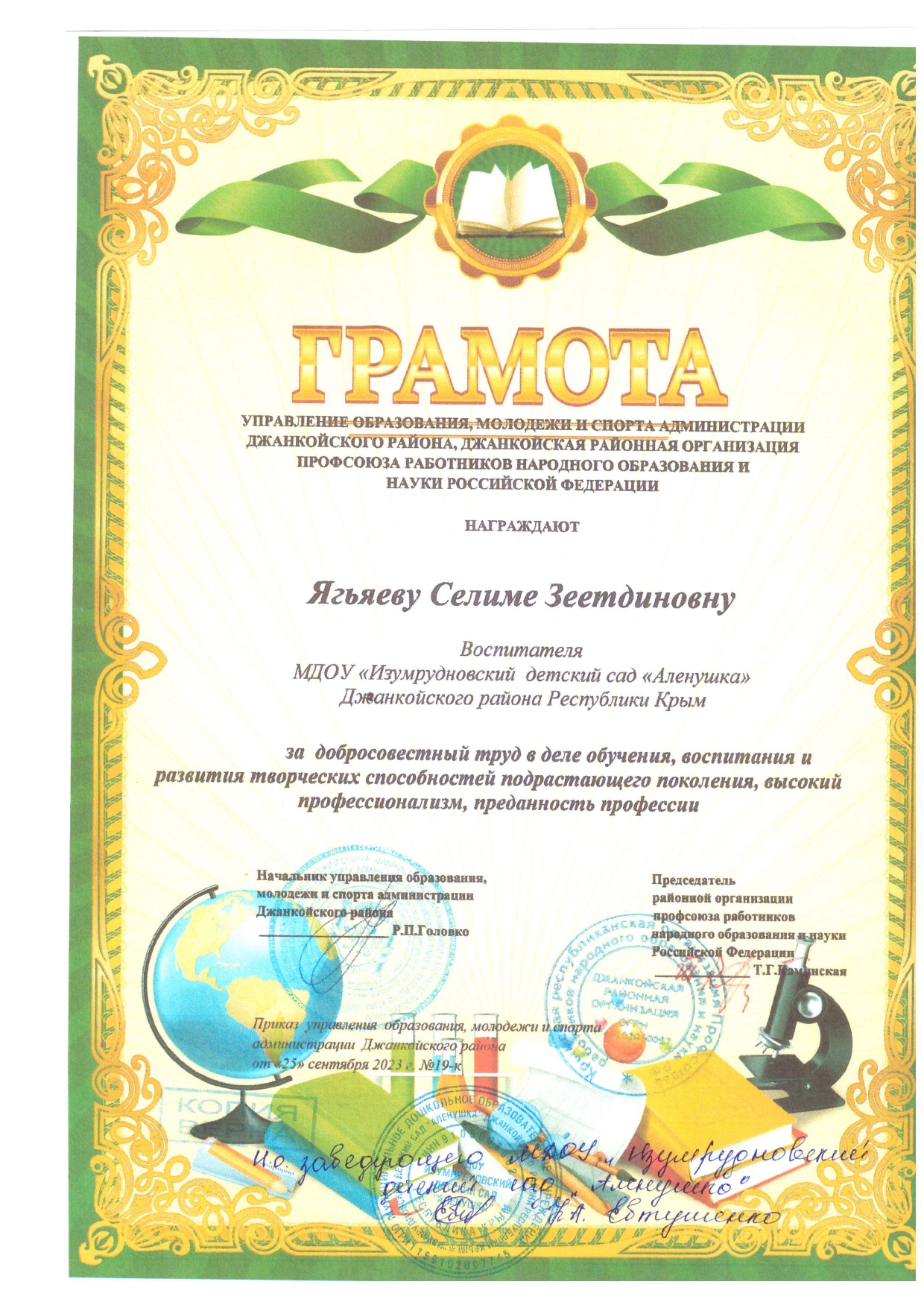 11) Грамота Управление образования, молодежи и спорта Администрации Джанкойского района, Джанкойская районная организация профсоюза работников народного образования и науки Российской Федерации за добросовестный труд, высокий профессионализм, значительный вклад в деле обучения и воспитания подрастающего поколения, и в связи с празднованием Дня воспитателя и всех дошкольных работников от 26.09.2025г., № 20-к.